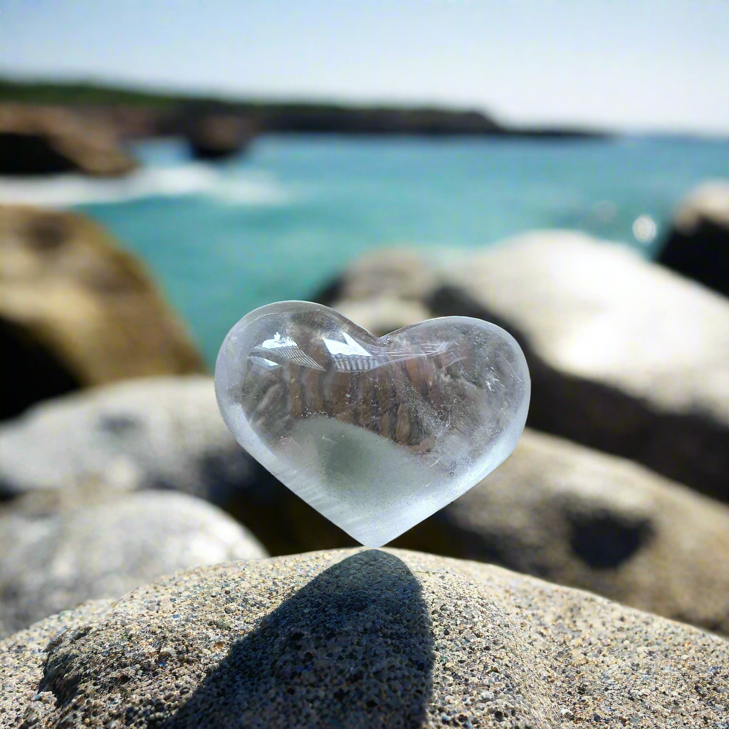 Klara, bulliga bergkristallhjärtan (ca 4 cm, 25–45 g) med vackra kloritinklusioner – vissa med små enhydro-bubblor. Varje hjärta är unikt och handplockat i fin kvalitet. Du får ett intuitivt utvalt exemplar, det allra finaste för dig.