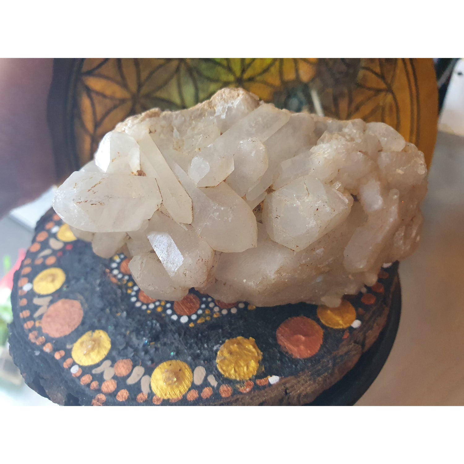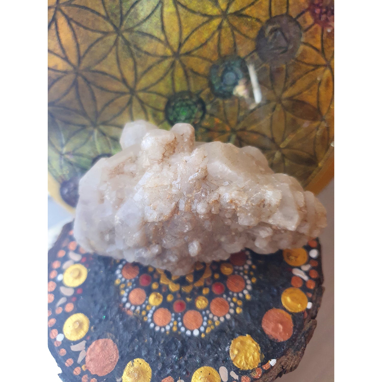 Ett personligt, kompakt lite" grövre" mörkare i färg, mjölkiga spetsar, bergkristallkluster inslag av turmalin, från Maharashtra♡