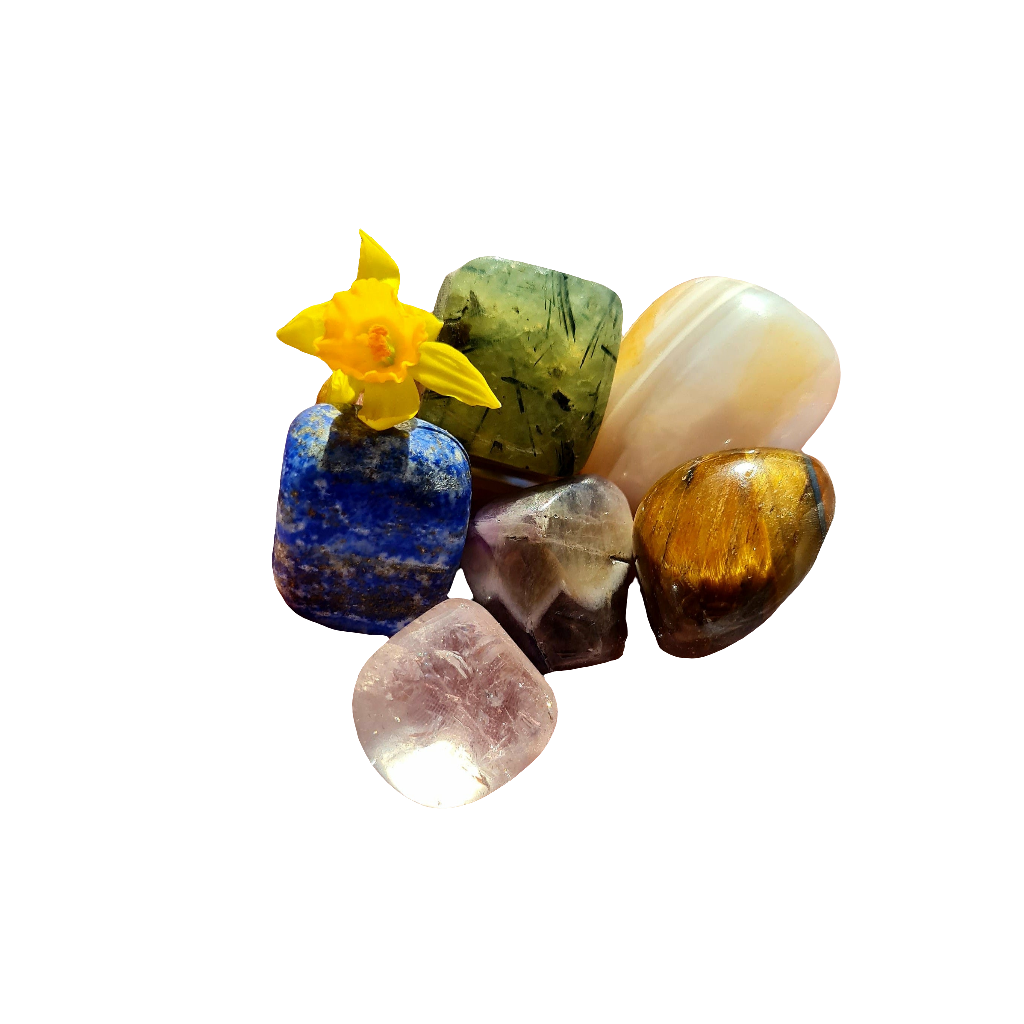 Innehåller: prehnit, lapislazuli, tigeröga, ametist, agat och bergkristall.
